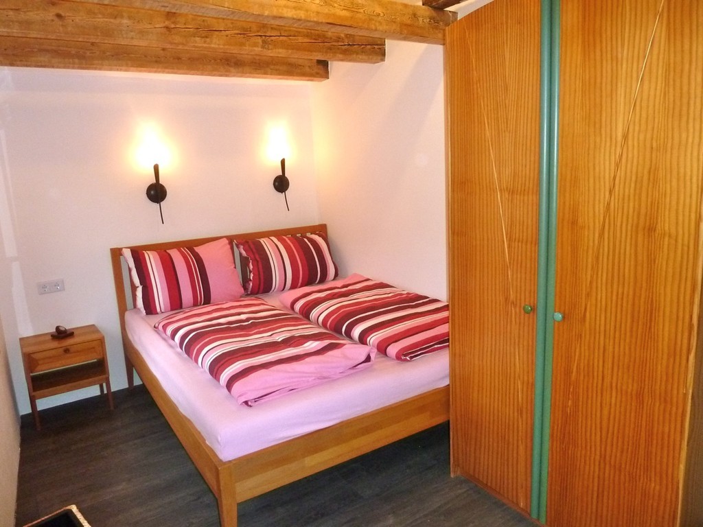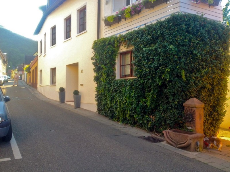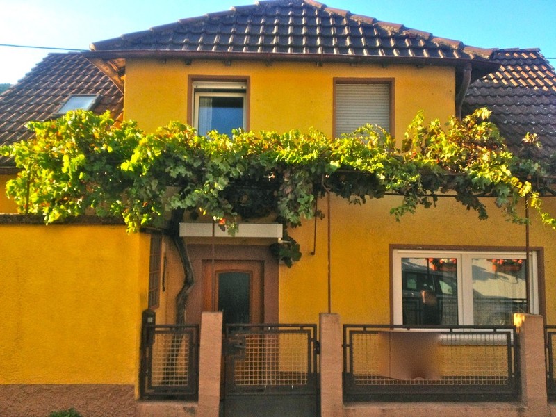 Die Front des kleinen, gelben Häuschens ziert ein Laubengang zwischen dem Hauseingang und der Tür zur Garage. Hier können Sie unter der 100 Jahre alten Portugieser-Rebe auf einer alten Steinbank verweilen.